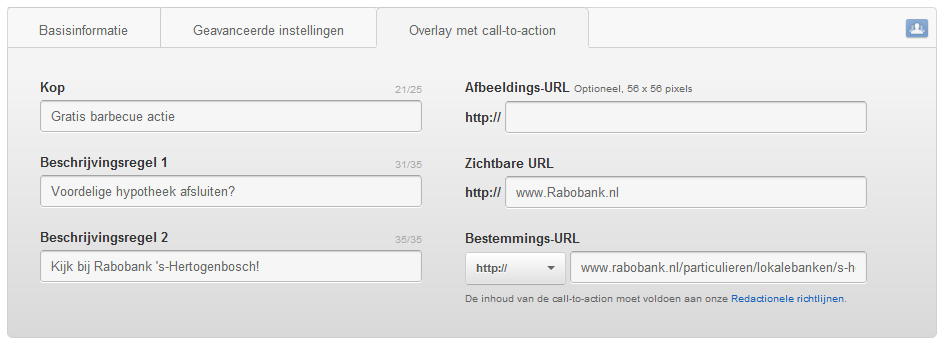 Wanneer je gebruik wilt maken van het displaynetwerk is het aan te raden om hier specifieke video’s voor te gebruiken. Een video van langer dan een halve minuut zal hoogstwaarschijnlijk minder effectief zijn. Vergeet ook niet gebruik te maken van de overlayfunctie (onder video-instellingen). Hiermee is het mogelijk om kijkers kosteloos naar een website te sturen. Houd er wel rekening mee dat deze ook op de ingesloten spelers wordt vertoond.