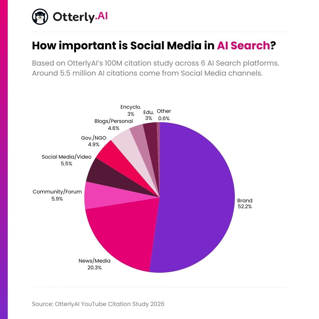 Van alle geanalyseerde citaties is 5,54% afkomstig van social media en videoplatforms. Binnen die categorie neemt YouTube 31,8% voor zijn rekening. Alleen Reddit doet het beter met 46,4%. Samen zijn Reddit en YouTube goed voor 78,2% van alle social media-citaties in AI-zoekmachines.