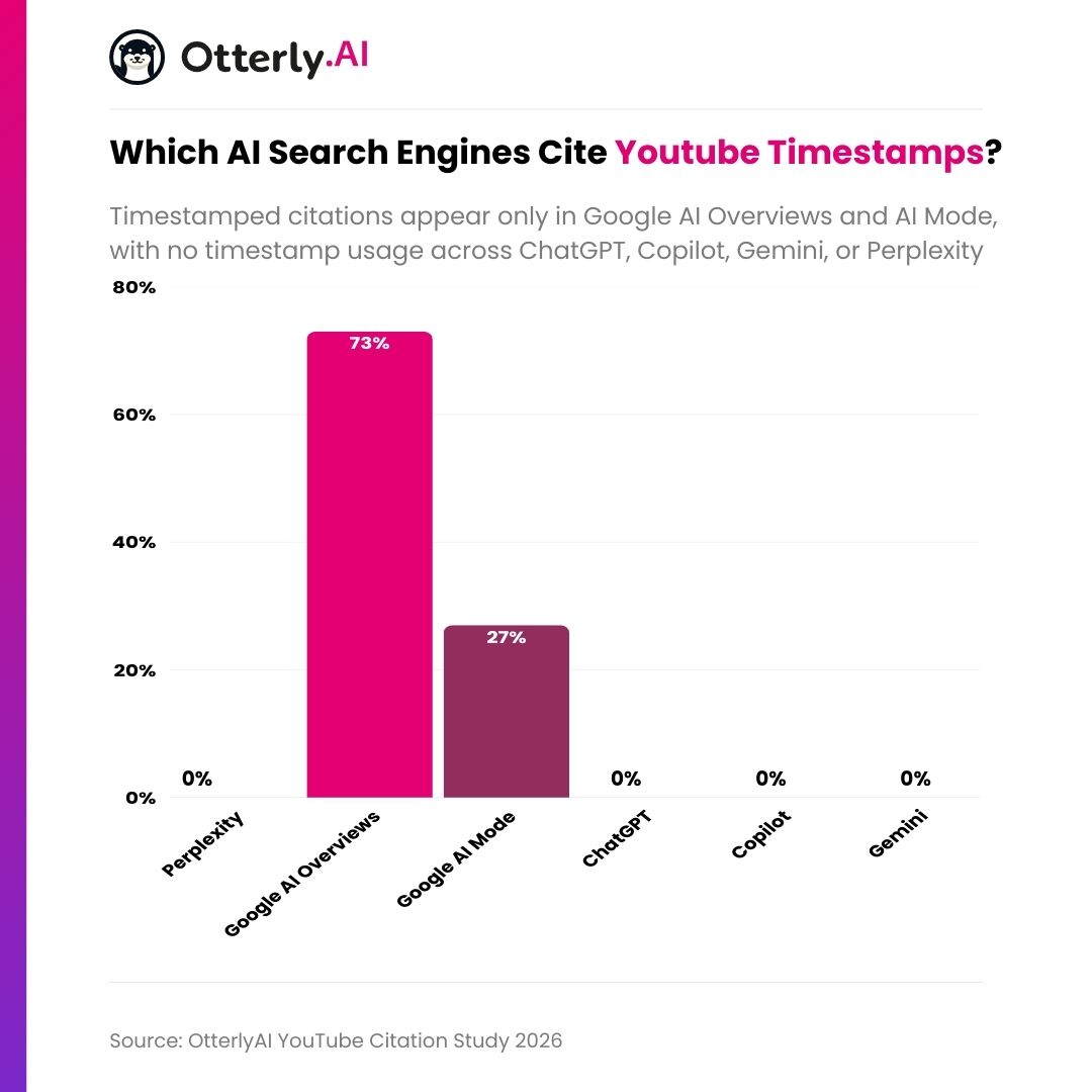 Timestamps en videohoofdstukken spelen een bijzondere rol, maar uitsluitend binnen Googles AI-platforms. Van alle geciteerde video’s met timestamp-structuur verschijnt 73% in Google AI Overviews en 27% in Google AI Mode. In ChatGPT, Perplexity, Copilot en Gemini werden tijdens de observatieperiode nul timestamped YouTube-citaties waargenomen.