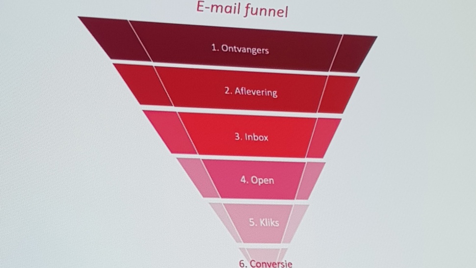 Monique Zwanenburg van ISM eCompany benoemt verder dat A/B-testen uitermate waardevol is voor e-mailmarketeers. Hierbij is het wel belangrijk om te kijken of A/B-testen überhaupt nodig is. Ze gaf hiervoor meerdere tips en tricks. Let om te beginnen op de positie binnen de e-mailfunnel. Deze funnel bestaat uit zes stappen: