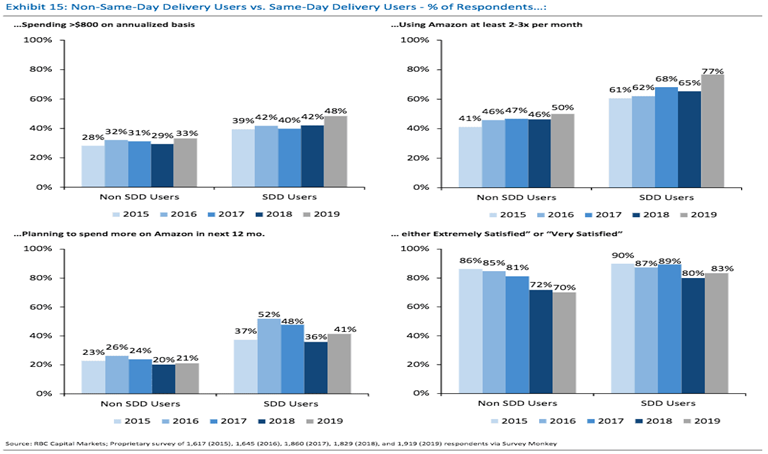 Gebruikers die gebruik kunnen maken van een bezorging die dezelfde dag plaatsvindt, besteden veel meer jaarlijks en winkelen vaker. Ze zijn over het algemeen ook meer tevreden over de service die ze krijgen en zullen dus waarschijnlijk binnen de komende twaalf maanden weer bij Amazon gaan winkelen.