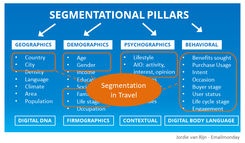 Als je weet wie je publiek is en je persona’s hebt opgesteld, kun je een sterk segmentatiemodel en getriggerde berichten maken. Je segmentatiemodel varieert afhankelijk van de doelgroepen en de aanbiedingen. Zo is een site die focust op jongerenreizen heel anders dan een algemene reissite. En promotie voor één bestemming of één keten is heel anders dan voor een portaal met meerdere bestemmingen en aanbieders.