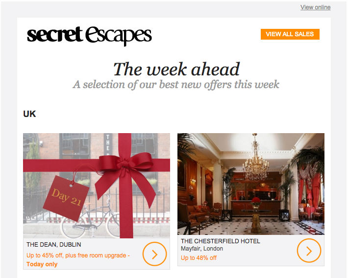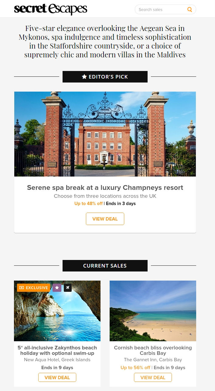 Bied je waarde of heb je interessante aanbiedingen, geef dit dan duidelijk aan. Secret Escapes licht exclusieve of nieuwe deals bijvoorbeeld uit met tags in de afbeeldingen van de bestemming en opent met een speciale selectie die de e-mail een persoonlijke touch geven (mochten we het vergeten: er zit ook een persoon aan de andere kant van die e-mail).