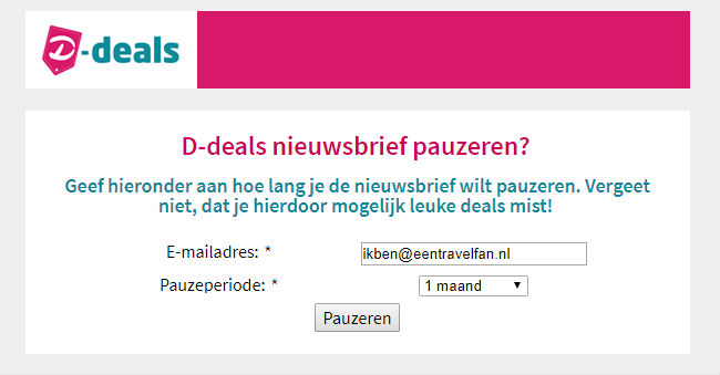 Maar het kan zijn dat uitschrijvers nog steeds geïnteresseerd zijn in reizen, alleen niet nú. E-mail is een manier om in contact te blijven, dus we willen onze commerciële opt-in niet kwijt. Wees slim en voeg een ‘Pauze’-knop toe, zoals bijvoorbeeld de D-deals, de dagelijkse aanbiedingen-mail van D-reizen. Als je op ‘Nieuwsbrief pauzeren’ klikt, word je doorverwezen naar een eenvoudig formulier waarmee je de verzending tijdelijk kunt stopzetten.