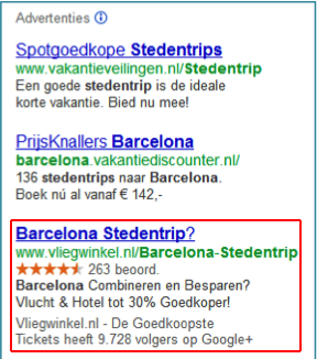 Zoals het voorbeeld van Vliegwinkel.nl laat zien wordt het Google+ account met enige regelmaat in de snippet van een advertenties geplaatst. Hierdoor groeit de advertentieruimte waardoor er meer exposure komt. Door de brandname te veranderen in een USP kan er een extra voordeel worden gecommuniceerd, waarmee een merk zich beter kan onderscheiden van de concurrentie.