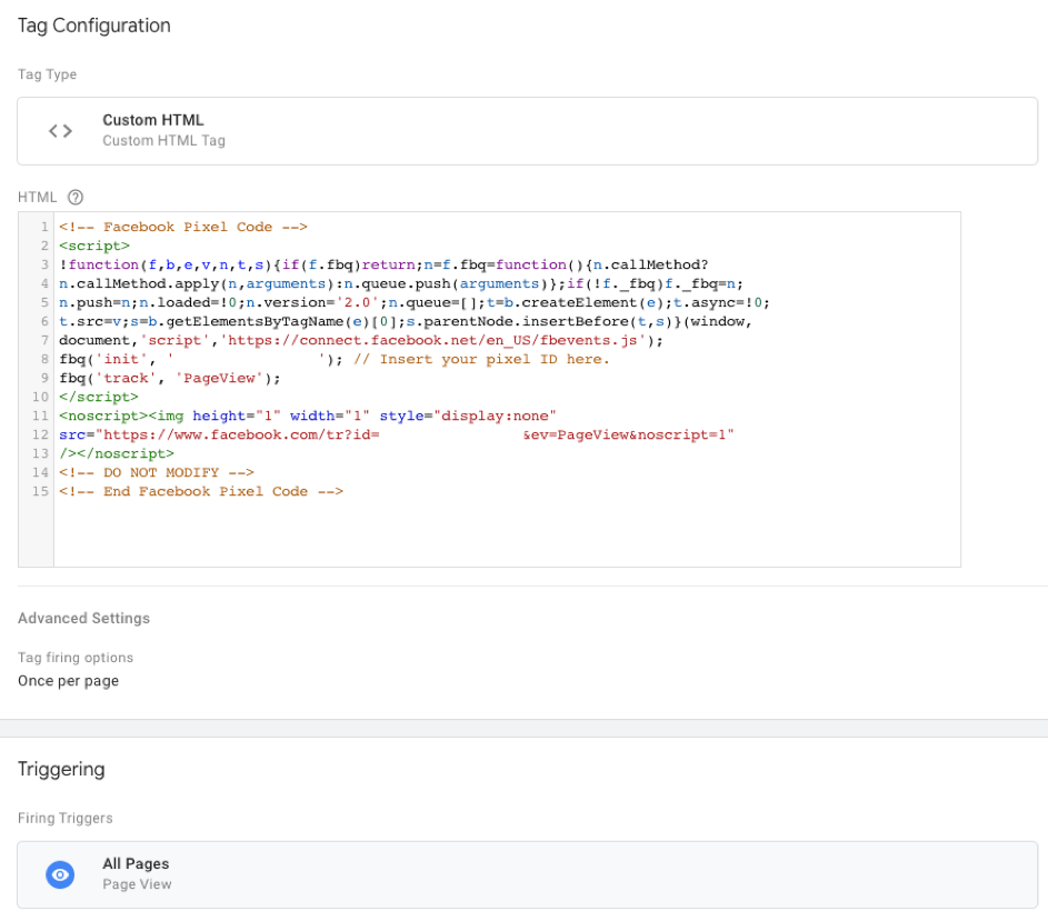 Een soortgelijke actie werkt bijvoorbeeld ook voor de tracking van Facebook. In het geval van de Facebook-pixel plaats je via Tag Manager het stukje script dat normaliter in de broncode van je website komt te staan. Dit werkt via een tag die gebruik maakt van ‘Custom HTML’. Door de Facebook-pixelcode hierin te plaatsen en deze te koppelen aan elke paginaweergave, zorg je ervoor dat je tracking op orde is zonder zelf te rommelen aan de broncode van je website.