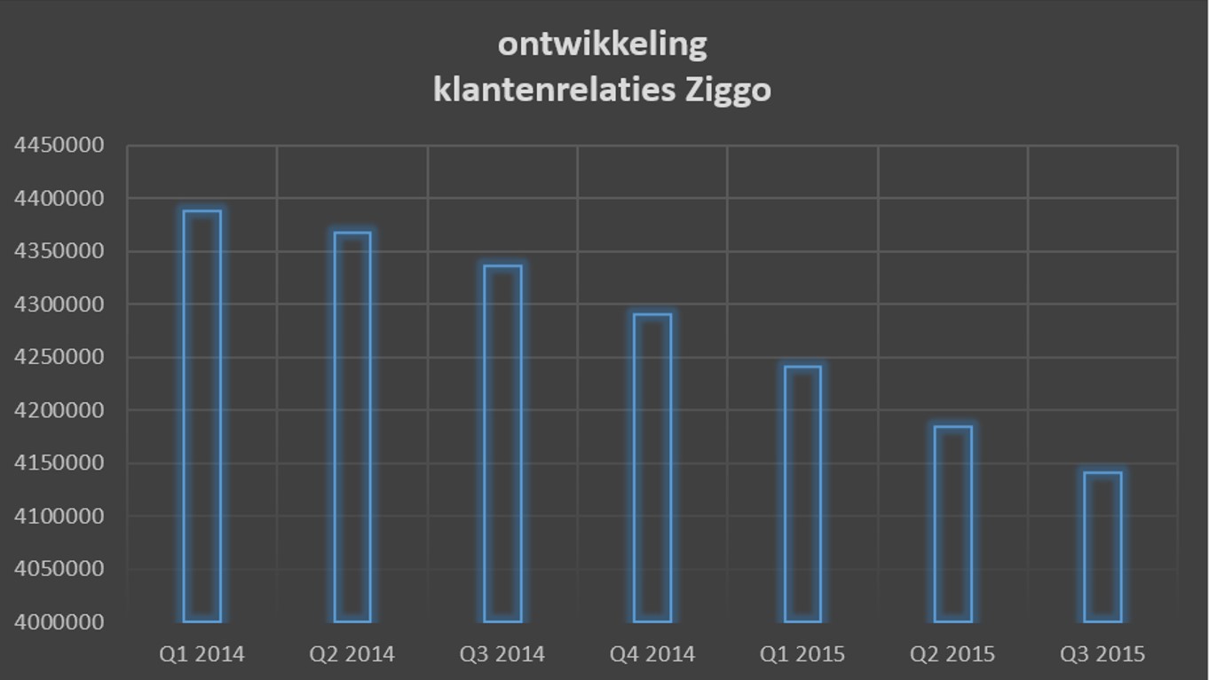 De overname van Ziggo door Liberty Global, het moederbedrijf van UPC, eind oktober 2014, heeft weliswaar het marktaandeel van de kabelaanbieder aanzienlijk vergroot, maar de samenvoeging van beide bedrijven heeft er niet toe geleid dat de neergang in het aantal abonnees een halt is toegeroepen. Bedroeg het aantal klantenrelaties eind september vorig jaar nog 4,33 miljoen, twaalf maanden later is dit teruggelopen tot 4,14 miljoen. Ofwel 4,5 procent van het totale bestand. Dit betekent dat de Amerikaanse (of Britse) mediagigant het afgelopen jaar ruim €100 miljoen aan bruto inkomsten lijkt te zijn misgelopen.