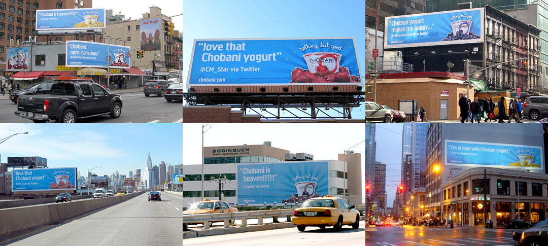 Ook Chobani, een Amerikaans yoghurtmerk, heeft op een creatieve manier gebruik gemaakt van de kracht van user-generated content. Het merk riep haar fans op video’s, foto’s en berichten te delen op hun eigen social media kanalen over hun favoriete yoghurt. De content werd vervolgens door het merk ingezet op verschillende manieren. Chobani heeft tweets ingezet in marketinguitingen op billboards en heeft de video’s op haar website gepubliceerd.