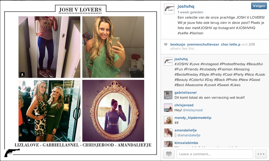 Modemerk JOSH V snapt hoe het hoort en roept haar doelgroep op om selfies te maken in de kleding van het merk en deze te delen op Instagram. Een groot gedeelte van de doelgroep bestaat uit jonge meiden die maar al te graag een foto van zichzelf maken en deze uploaden in de hoop dat hun foto door @joshvhq wordt gedeeld. Een leuke actie die past bij de doelgroep en waarbij de fans actief deel uit kunnen maken van het merk.
