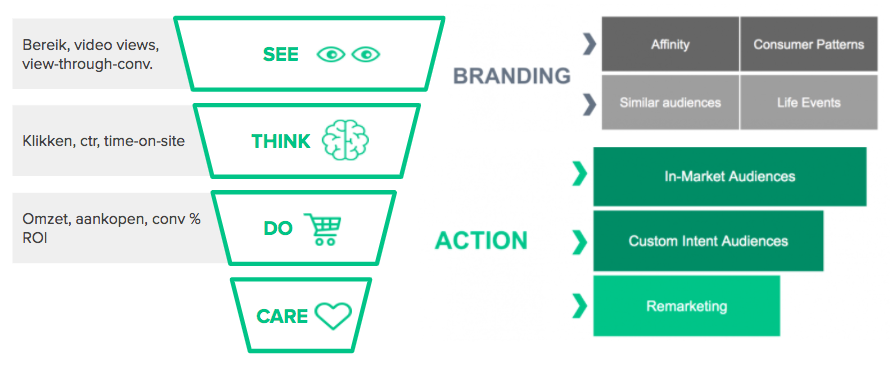 Zet je awareness-campagnes uit fase twee tijdig om in jouw convert-fase-campagnes. Zodoende heeft het Google-algoritme nog voldoende tijd om te leren. Onderstaande targeting-mogelijkheden passen goed bij deze fase: