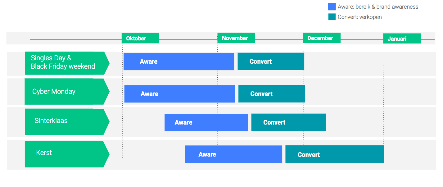 Waar begin je? Start bij het uittekenen van je customer journey en het opstellen van een marketingplanning. Onderstaande kalender helpt je hierbij op weg. Begin in oktober met je awareness-campagnes (see-fase) en het opbouwen van doelgroepen (think-fase). Focus je vanaf de tweede week van november op het converteren van bezoeken in online aankopen (do-fase).