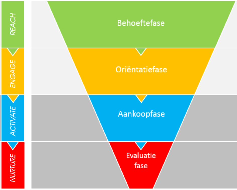 Het REAN-model sluit aan bij de 4 verschillende fases van het koopproces van de consument: