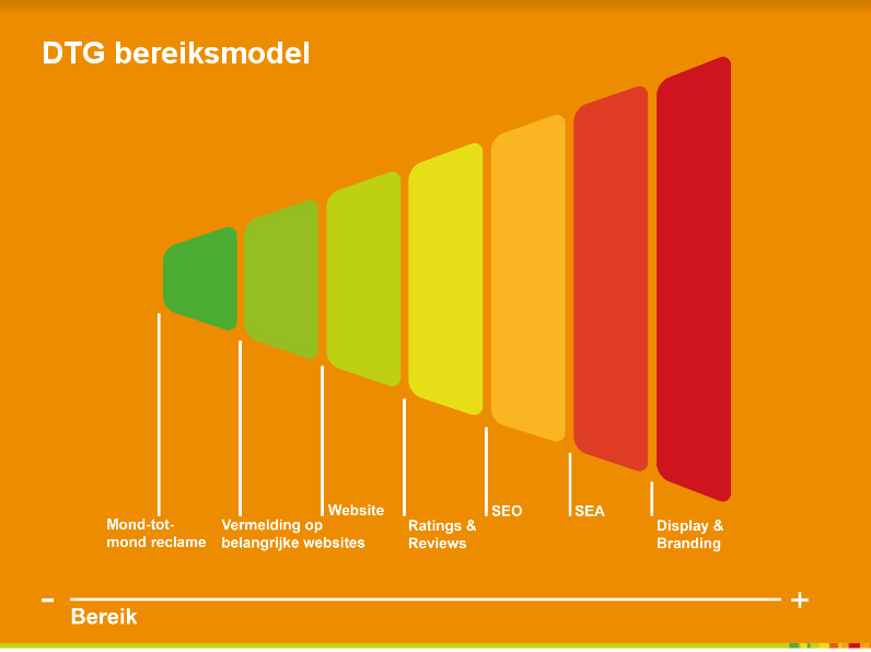 Het DTG bereiksmodel laat de cost per contact of de cost per lead zien in. Je begint met SEA aan de linkerzijde van het model (mond-tot-mond reclame, donkergroene balk). De kosten zijn dan laag, maar het bereik is klein. Je schuift vervolgens naar verloop van tijd op naar rechts, richting de rode balk. Bij display & branding – denk bijvoorbeeld aan televisiereclame – is het bereik groot maar zijn de kosten voor conversie hoog. Je bent dan eigenlijk met hagel aan het schieten.