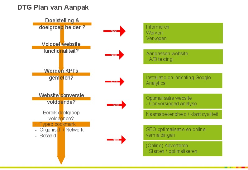 Het tweede model dat is zoals gezegd een plan van aanpak voor online marketing, in vijf stappen of vragen. Dit model is meer als flowchart vormgegeven en ziet er zo uit: