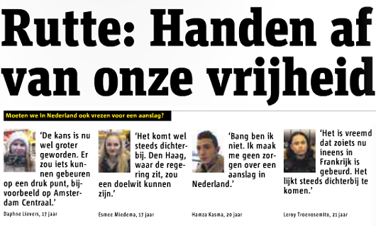 Het opvallende is echter dat als Twitter niet als bron wordt aangehaald, het beeld niet veel anders is. Dan gaan journalisten voor de televisie de straat op en interviewen ze twee mensen die iets roepen (dat zorgt weer voor parodieën). Voor journalisten van de schrijvende pers geldt dat er regelmatig willekeurige mensen wordt gequote. Zie onderstaande afbeelding of denk aan het EenVandaag Opiniepanel. Kortom, het is nooit anders geweest.