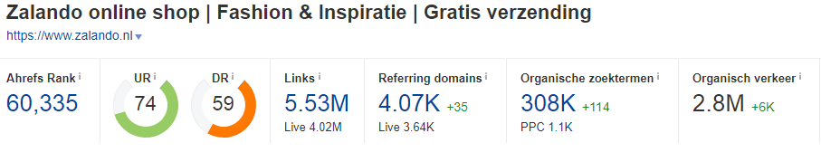 Allereerst is het zaak om de algehele autoriteit van je website flink op te hogen. Vooral als je een website met honderden pagina’s hebt, is het zaak om vanuit een flinke autoriteit te werk te gaan. Een goed voorbeeld hiervan is Zalando (zie onderstaande afbeelding), met misschien wel tienduizenden pagina’s (ik heb ze geprobeerd te tellen, maar ben op een gegeven moment afgehaakt).