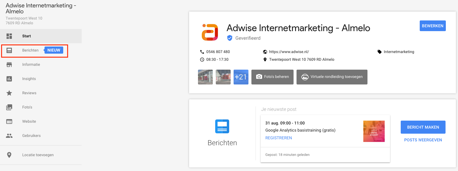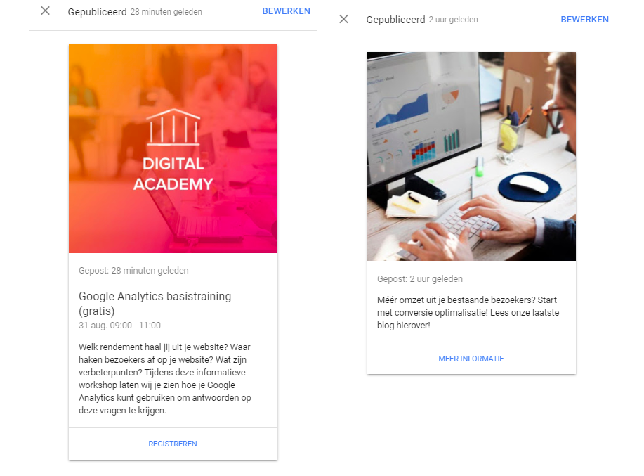 Let op: Google Posts blijven ongeveer zeven dagen online en daarna komen ze te vervallen. Je moet dan dus weer nieuwe Google Post toevoegen. Meer informatie hierover lees je in dit artikel.