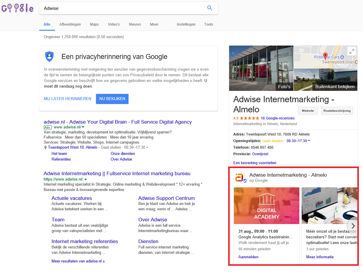 Wanneer je via Google zoekt op (in dit geval) onze bedrijfsnaam, dan zie je de Google Posts aan de rechterkant onder de overige bedrijfsgegevens verschijnen.