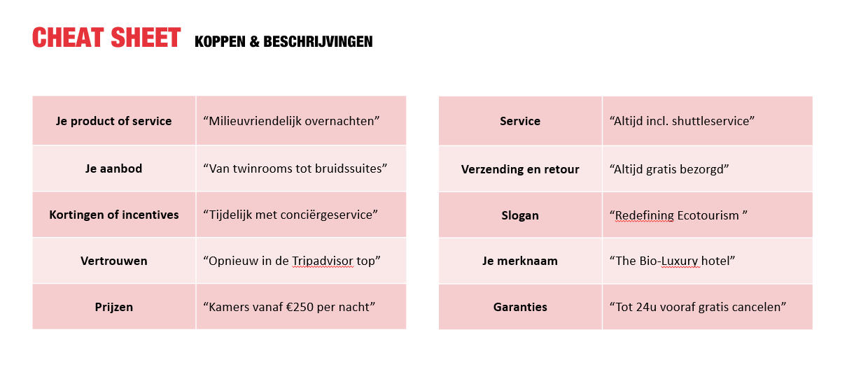 Wat zijn de redenen waarom mensen kiezen voor jouw hotel en niet dat van een ander? Het is altijd belangrijk om helder te hebben wat de unique selling points zijn van jouw product of dienst. Als je dat goed in kaart hebt, kun je de ontwikkeling van je nieuwe ads hierop baseren.