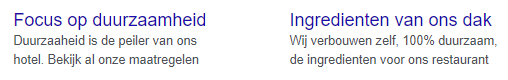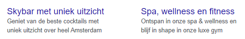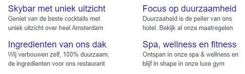 Bij structured snippets is het mogelijk om elementen te clusteren. Als we de buyer motives van het hotel er weer bij pakken zouden we bijvoorbeeld de volgende Structured snippet kunnen gebruiken: