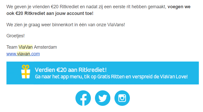 ViaVan maakt het sturen van een ‘referral’ zeer eenvoudig voor gebruikers. Door een korting aan te bieden, geven ze de ontvanger een extra stimulans om de transactie te voltooien. Aangezien ze de korting ontvangen van een bekende die al gebruik heeft gemaakt van ViaVan, zullen ze sneller de conclusie trekken dat het bedrijf te vertrouwen is.