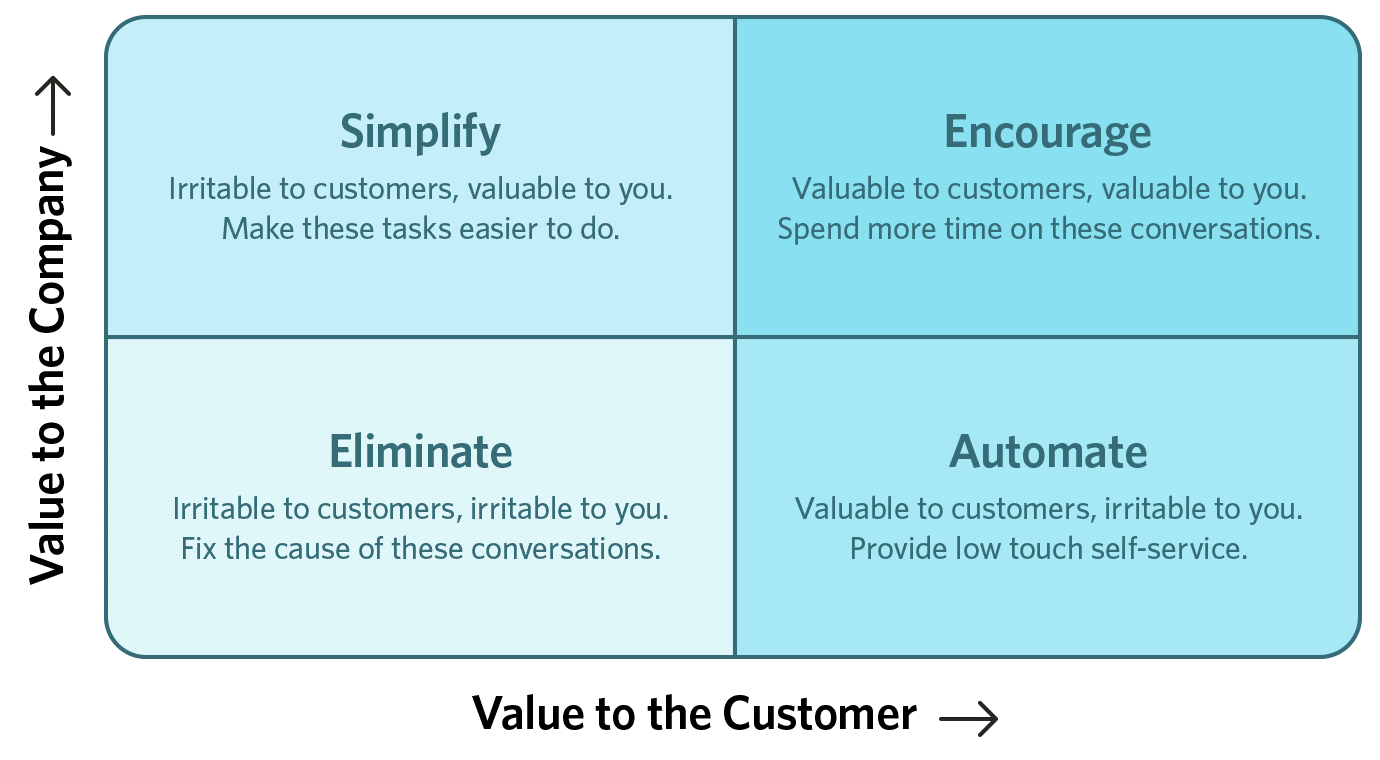In deze matrix worden alle (veel voorkomende) interacties/journeys geplot door ze te scoren op twee assen: belang voor de organisatie en belang voor de klant. Het mooie aan deze matrix is dat duidelijk wordt dat beide belangen kunnen worden verenigd en dat de gewenste strategie per kwadrant ook duidelijk is. Dit geeft de organisatie houvast in tijden dat die er nauwelijks is.