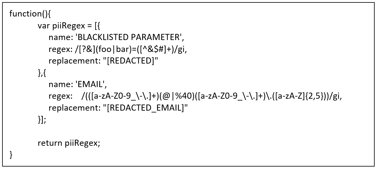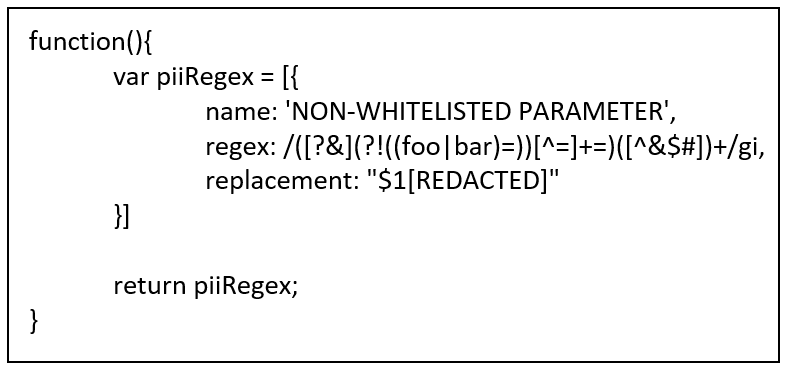 - Definieer binnen de nieuwe variabele een array met daarin een object met drie keys: ’name’, ‘regex’ en ‘replacement’. Geef voor de name key een string op waarmee je beschrijft om welk type gegeven het gaat als het niet in de whitelist voorkomt. Ik gebruik in dit geval ‘NON-WHITELISTED PARAMETER’. Geef voor de regex key de reguliere expressie op waaraan het type gegeven voldoet dat niet de whitelist voorkomt – in dit geval alle parameters behalve “foo” en “bar”. Geef voor de replacement key de string op waarmee het persoonsgegeven vervangen moet worden. Hierbij verwijst een “$” gevolgd door een cijfer het nummer van de capturing group aan waarvan de match behouden moet blijven in de vervanging.