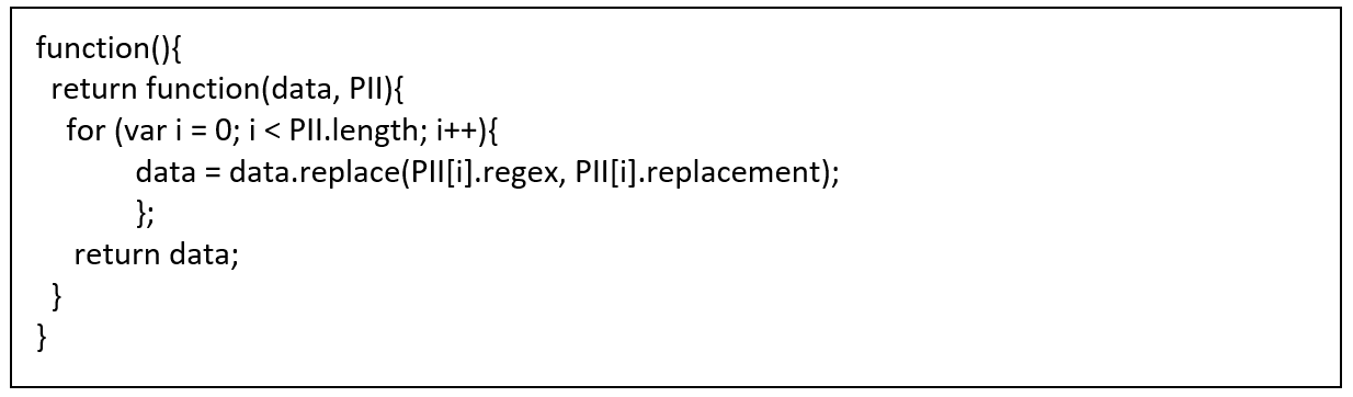 - De variabele returnt een functie met twee parameters: de eerste parameter is een gegevensstring, de tweede parameter is de eerder gedefinieerde blacklist die we ‘PII’ hebben genoemd. Voor elk van de gedefinieerde persoonsgegevens in de blacklist checkt de functie of de reguliere expressie voorkomt in de gegevensstring, totdat er een match is. Op dat moment wordt het persoonsgegeven de gegevensstring vervangen door de bijbehorende waarde van de replacement key, en geeft de functie de gegevensstring terug, waarbij persoonsgegevens vervangen zijn.