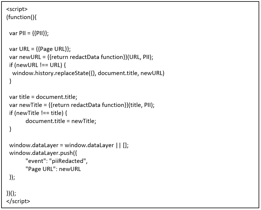 - De tag a) leest de titel en URL uit van de webpagina waarop de tag geladen wordt, b) vervangt middels bovenstaande functie de eerder gedefinieerde persoonsgegevens in de titel en URL van de webpagina, c) past, indien persoonsgegevens aanwezig zijn, de URL in de browser aan en/of vervangt de titel van de webpagina, en d) verstuurt een event “piiRedacted” naar de dataLayer, tezamen met de nieuwe URL.
