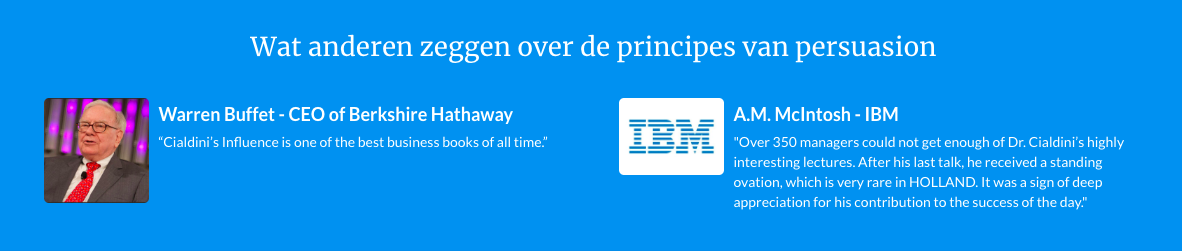 De autoriteit van Cialdini wordt bijvoorbeeld verhoogd door uitspraken van Warren Buffet en IBM: