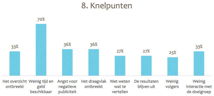 Draagvlak is altijd een veelgehoord tegenargument. Er wordt al snel geroepen dat er ‘van bovenaf’ geen ondersteuning is, en die beleving is er in de zorg ook. Vaak spelen de hiërarchie en uiteenlopende afdelingen hier een rol in. Respondenten gaven regelmatig te kennen dat er visie of prioriteit mist vanuit het management; en dat social media gezien wordt als iets wat bij de afdeling communicatie ligt, terwijl er juist behoefte is om namens meerdere afdelingen te communiceren.