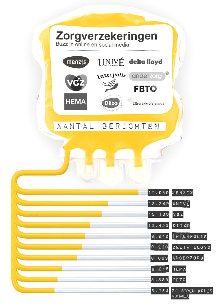 De merken die de meeste buzz wisten te veroorzaken, waren net als in het onderzoek van vorig jaar Menzis en Univé, VGZ is de nieuwe nummer drie (2012: Delta Llloyd). Anderzorg en de nieuwe aanbieder Hema Zorgverzekering staan dit jaar in de top-10 ten koste van OHRA en Agis. Opvallend is verder dat vooral de merken Anderzorg, Ditzo en FBTO goed scoren door buzz via sociale media, en dan met name via Twitter. Verreweg de meeste berichten worden überhaupt geplaatst op Twitter, gevolgd door Facebook.
